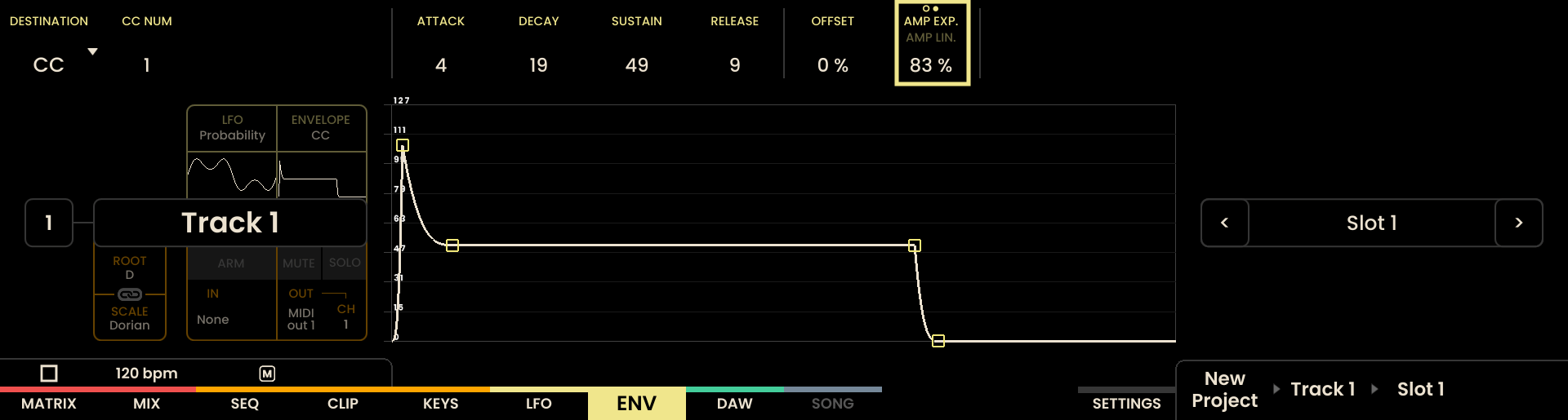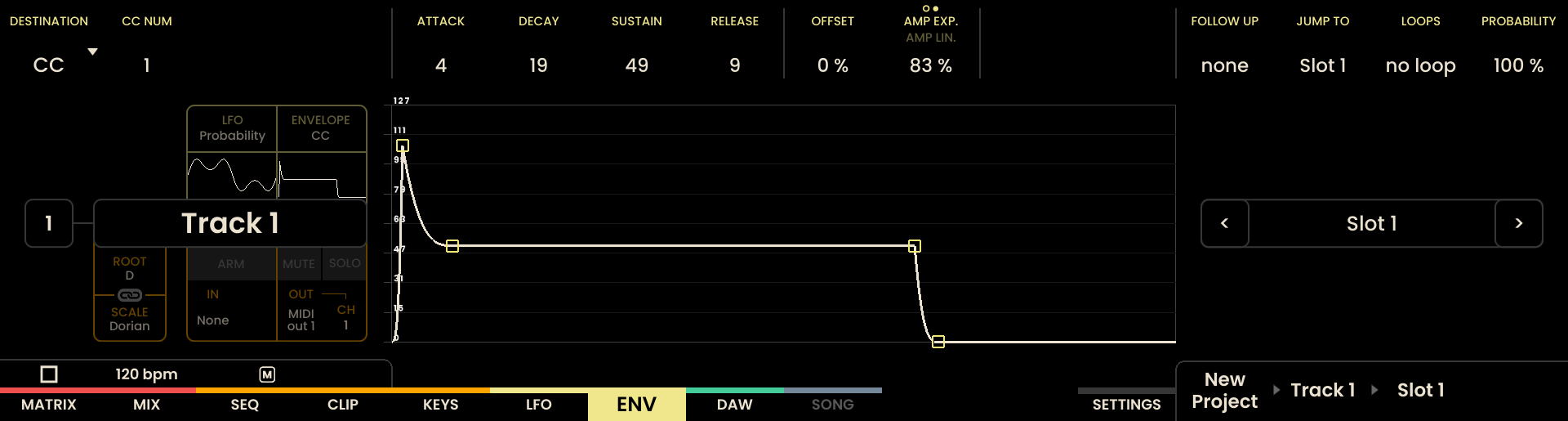 Each track’s envelope has 128 slots that can be stored, recalled, and sequenced. Each envelope Slot contains the following settings: