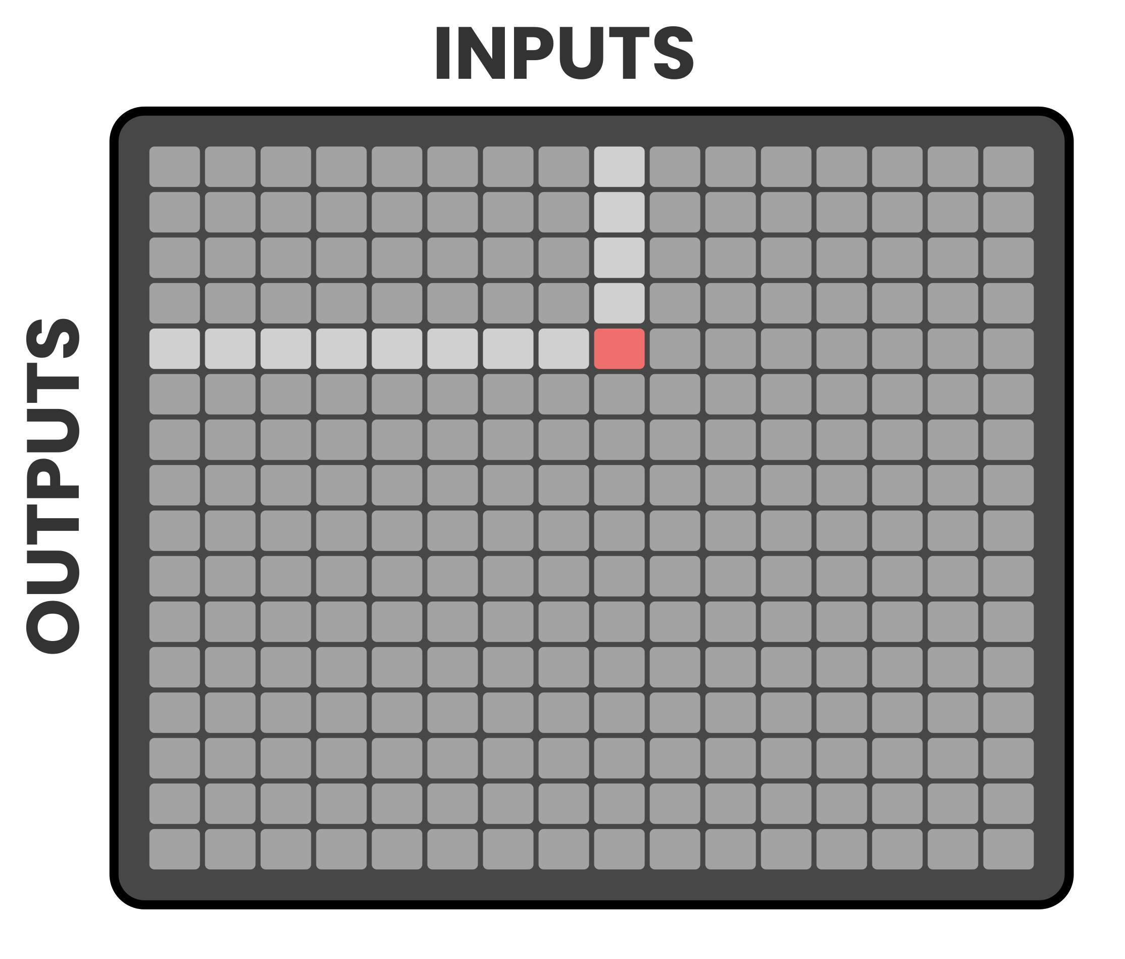 The Grid Pads, offer a visual and tactile interface for making connections. Each column corresponds to an input, and each row corresponds to an output.