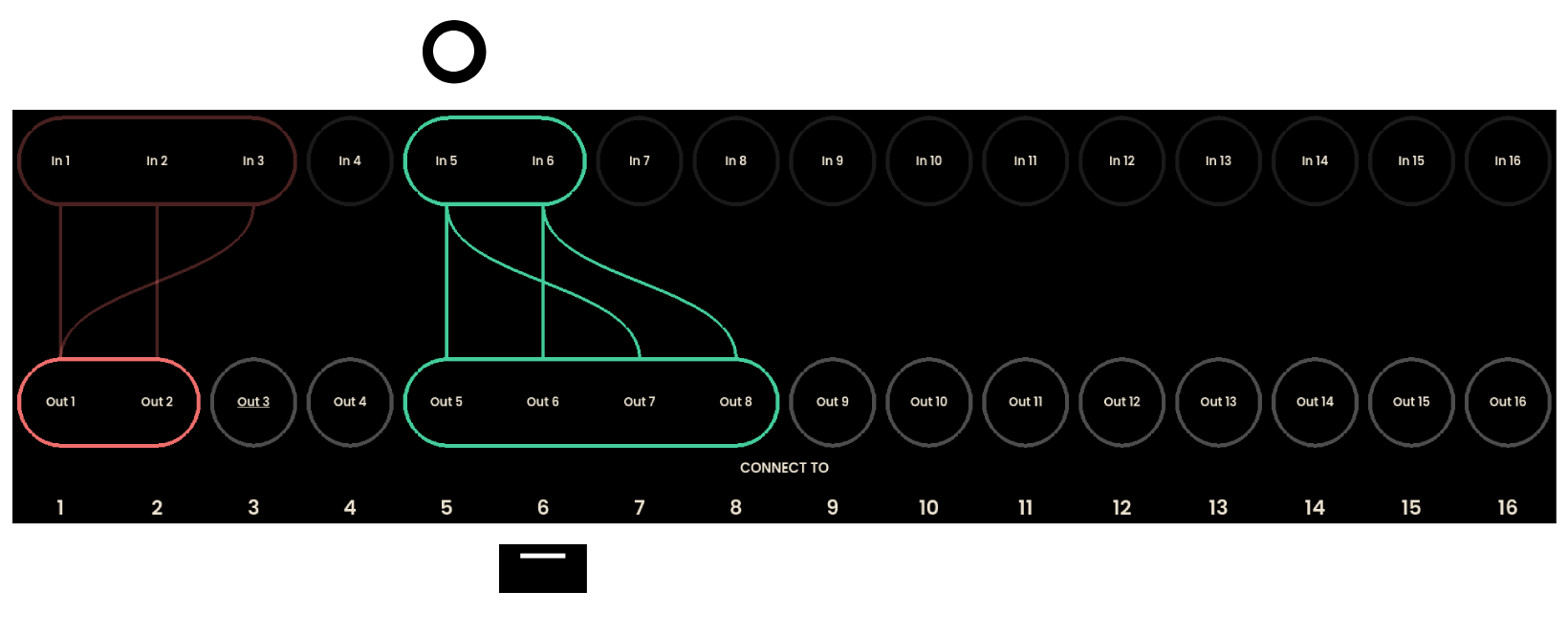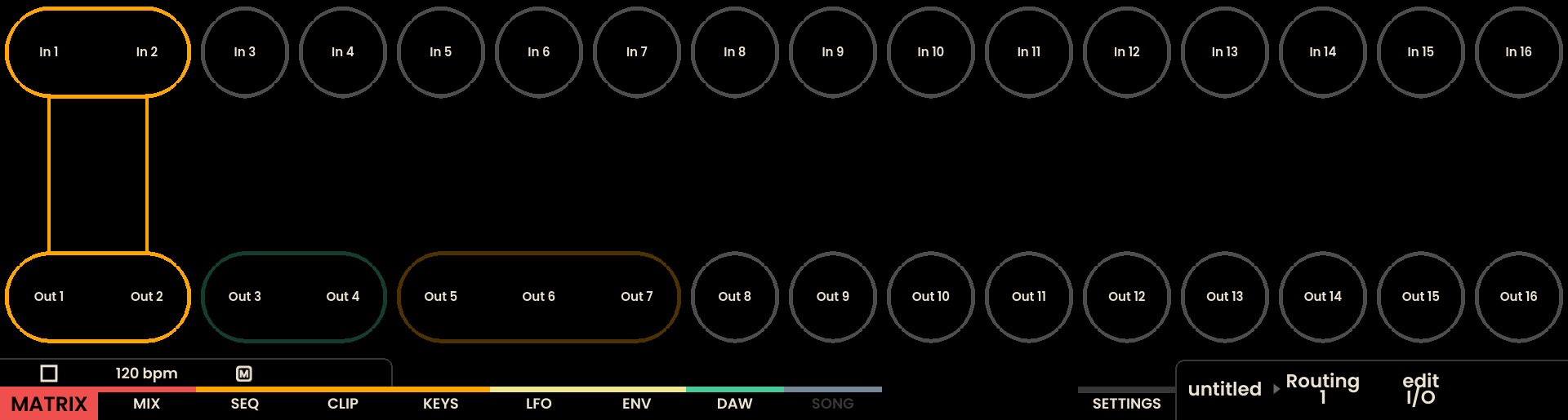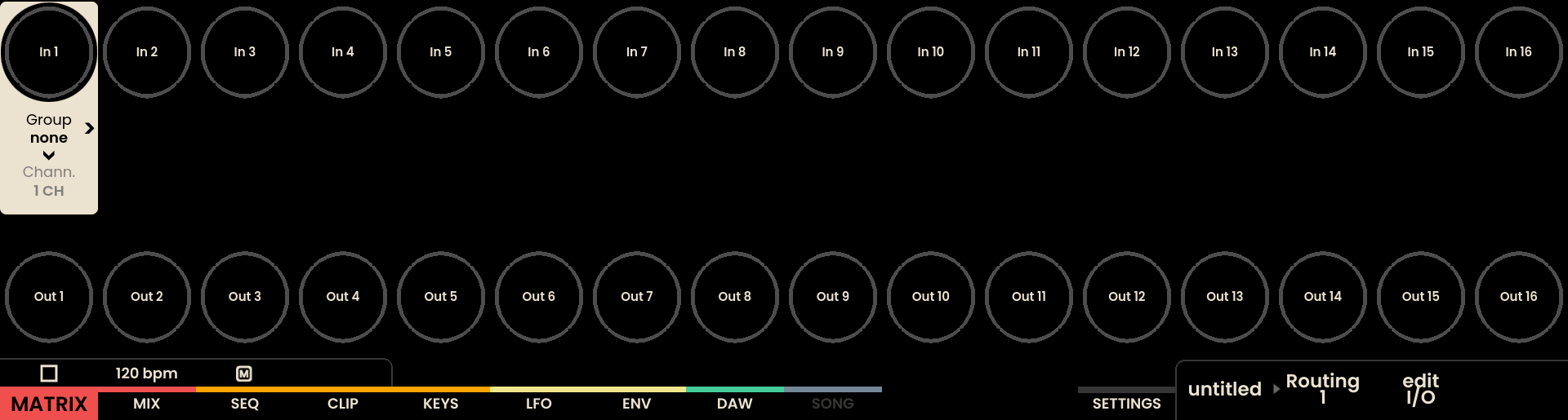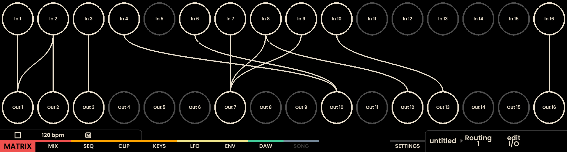 The Matrix page on Reliq’s display is divided into two horizontal sections. The top section features sixteen circular nodes, each representing one of the 16 inputs on the Breakout Module. The name of the input is displayed at the center of each node. In the bottom section, 16 circular nodes represent the outputs on the Breakout Module. When a connection is formed, a line visually links the corresponding input node to its output.
