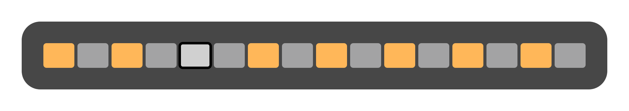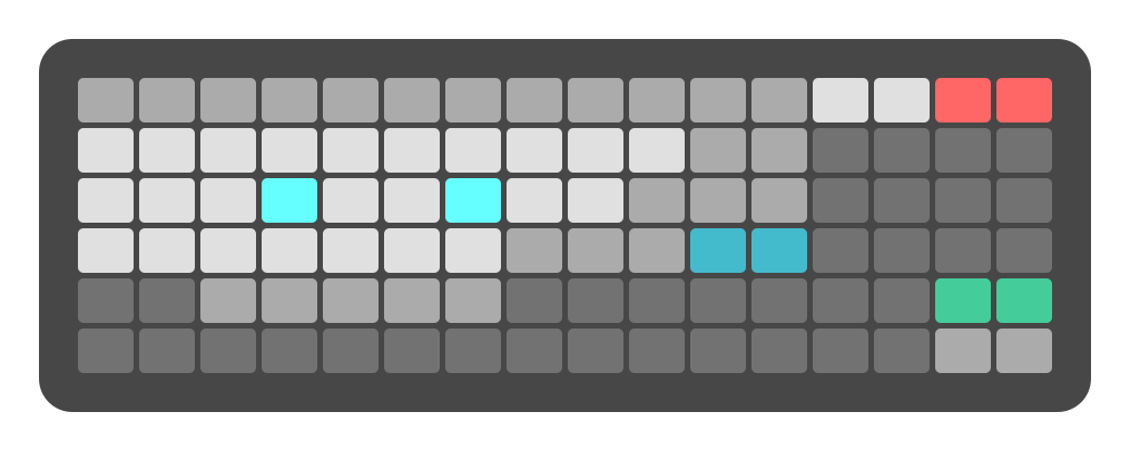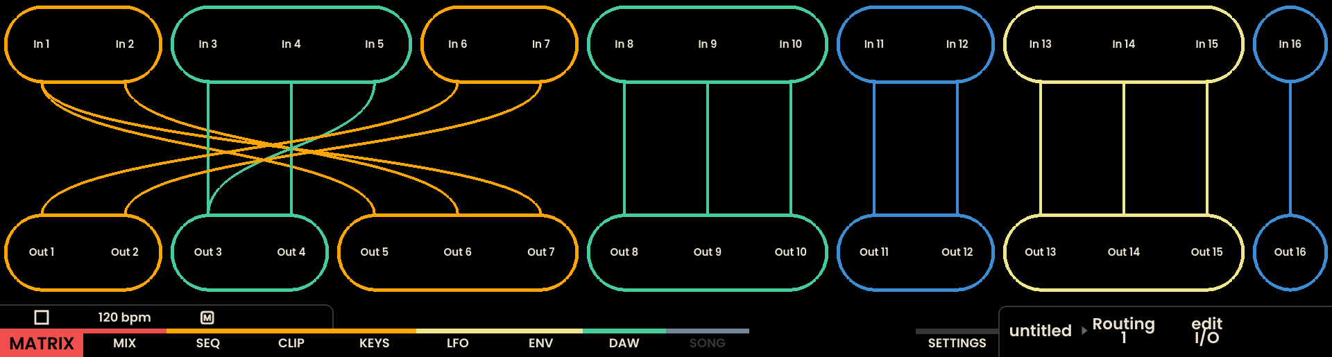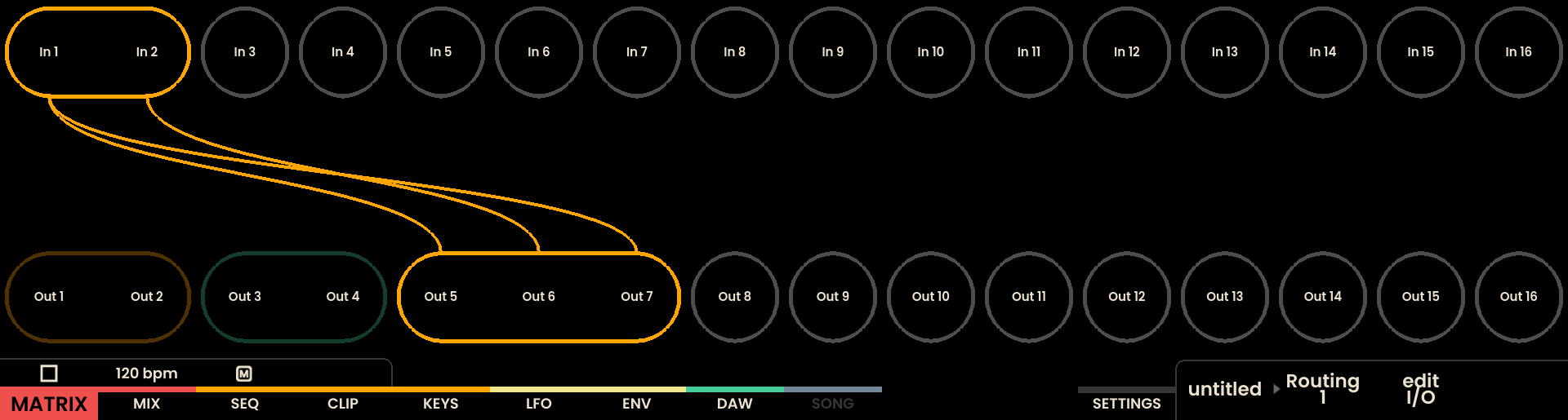 The 16th row of the grid can toggle between normal connection view and routing view by pressing Track Button . In routing view, the pads in this row display both active and stored routings. The currently active routing is highlighted on the bottom-right corner of the display.