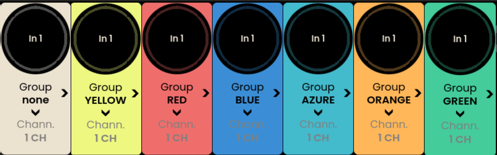 Each group is assigned a color, and only groups of the same color can be connected together. For example, an orange input group can only connect to an orange output group. The number of channels in a group can vary from one channel to the maximum of 16 available channels.