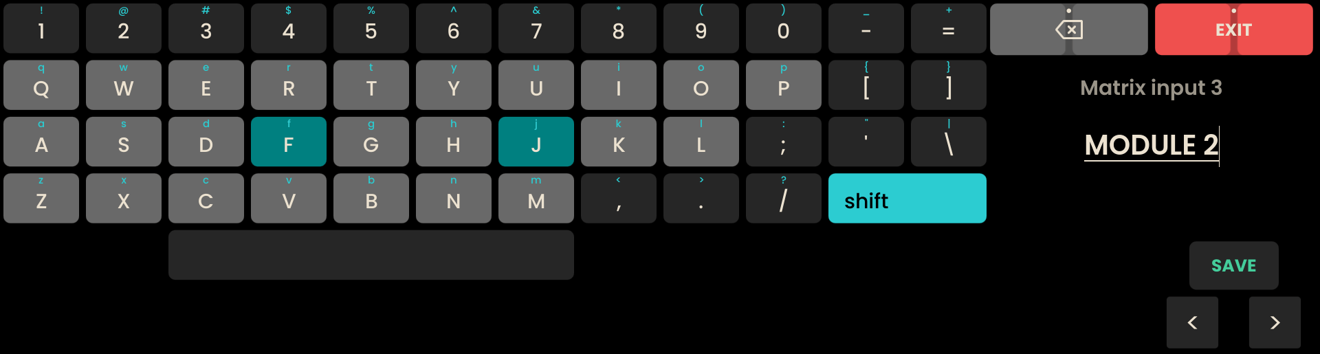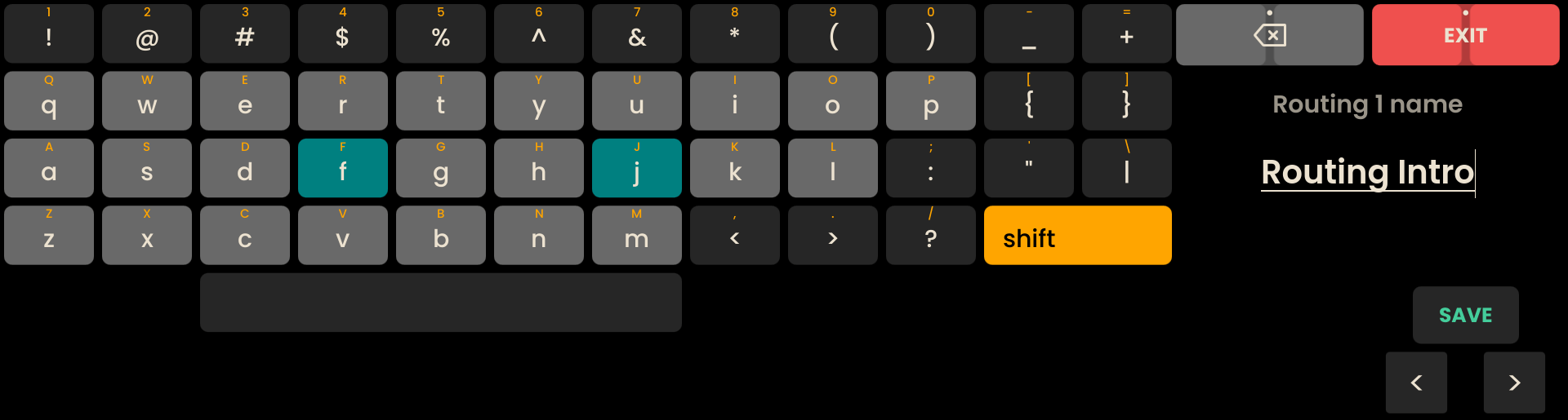 The same workflow and keyboard interface apply to naming routings. Once the desired name is entered, press to save the routing name and close the keyboard.